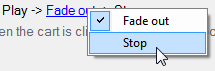 The playback sequence determines how the cart behaves when the cart is clicked on the main interface. In this example, the cart will Play, then Fade out, then Stop respectively for each mouse click. To change how the cart behaves, click any blue link. For example 'Fade out' above will display the following options allowing you to change this to Stop immediately: