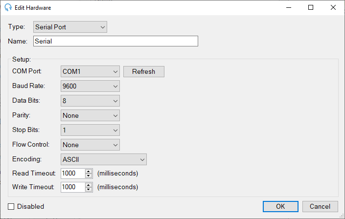 The Setup section contains connection parameters specific to the hardware type selected. Configuration options vary by hardware type: