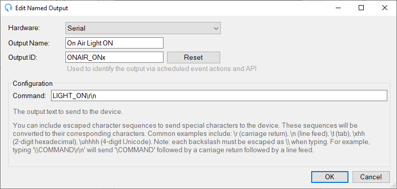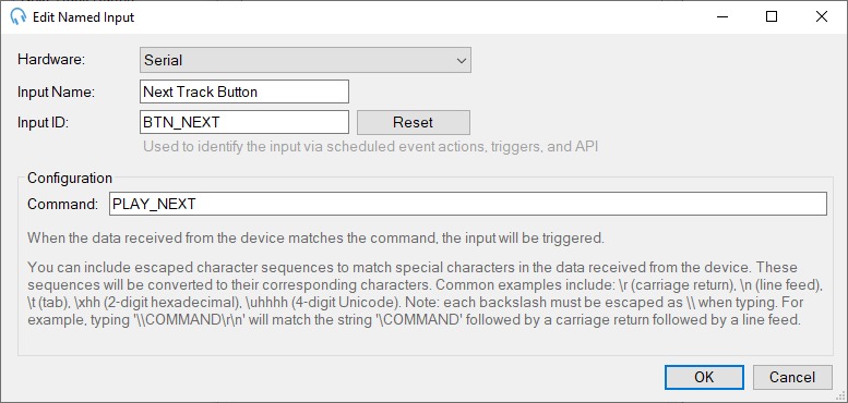Name: A descriptive name for this hardware device (e.g., "Serial", "Studio Controller", "Main GPIO"). This name will appear in dropdown menus when creating Named Outputs and Named Inputs.