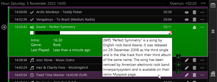 ![]() The Out Cue, Intro, Album, Genre and Year are displayed on the left with the Comment field displayed on the right. If any field is too long to be displayed in the box you can hover over the text to display the full text.