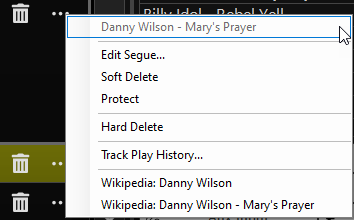 Click the Ellipsis button to expand the context menu for the playout log item. Here it is possible to perform additional actions on the item such as Edit Segue, Edit Track, Delete, Track Play History, or visit Web Links. Right-clicking a playout log item will also bring up the same menu.
