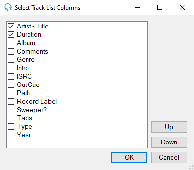 ![]() The track list shows a list of tracks added to the system. Tracks in this list can be managed from Manage > Tracks. The list shows each track in the form Artist - Title with the duration in the second column. Click either column to sort by that column, click the column again to reverse the sort order. The list can be filtered using the search box or the Track Group selector above. It is possible to select the columns in this list by right-clicking a column and selecting Select Columns. This will allow you to select and reorder the columns using the Up and Down buttons.