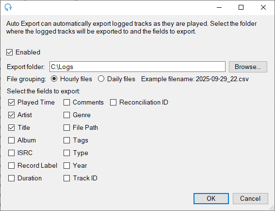 Auto Export automatically exports logged tracks as they are played. When enabled, a CSV file is created for each hour or day (depending on your file grouping selection), and track information is appended to that file each time a track is logged. Click the Auto Export button to configure the export folder and select which track fields to include. The exported files can be easily imported into spreadsheet applications or other systems such as third-party schedulers for reconciliation.