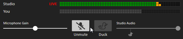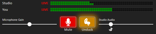 Click Unmute to activate your microphone and go live on air. A visual indicator at the top of the screen confirms that your microphone is live. To lower the volume of the studio audio and speak over it (e.g., to introduce a song), press the Duck button. You can adjust the ducking level by sliding the duck marker on the Studio Audio slider.