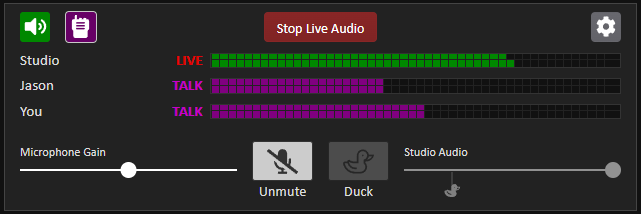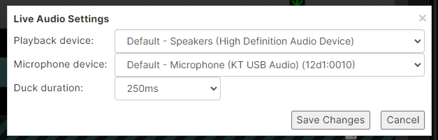 You should check your audio settings to ensure your playback device, microphone device and duck duration are configured to your preference. Click the cog icon to access Live Audio Settings.