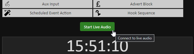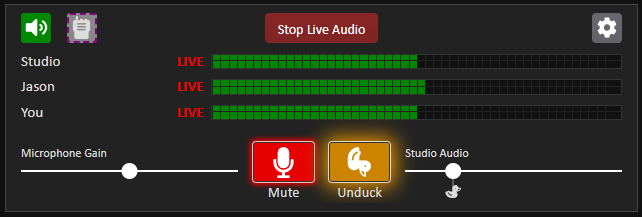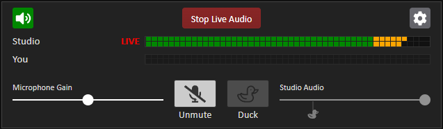 When it's time for you to go live, you should click Start Live Audio. You will immediately hear the audio from the studio in real-time. To mute the monitored audio from the studio, click the green Speaker icon.