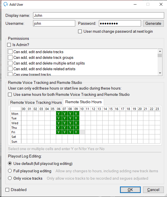 Otherwise, select the hours during which the user is allowed to broadcast using Remote Studio. They can log in anytime to plan their show, but can only go live during the specified hours (with a 5-minute buffer on either side).