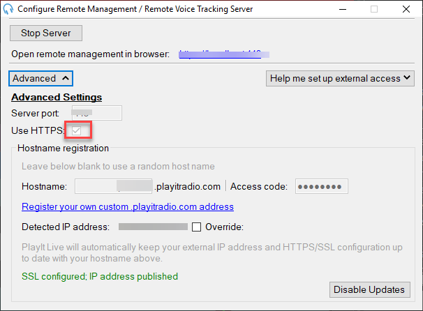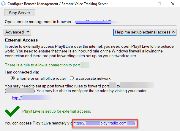 At the bottom of this window you will see the address that can be used to access PlayIt Live remotely. Make a note of this address, as this is what you will give to remote presenters to plan and broadcast their show.