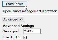 Expland the Advanced section, ensure that Use HTTPS is checked. The default server port of 25433 should be fine. Click Start Server