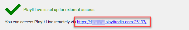 This will enable remote connections to PlayIt Live. Depending on your configuration, you may be required to configure your Windows Firewall and network port forwarding to allow connections from outside your network. You can use the Help me set up external access button to assist you with this.