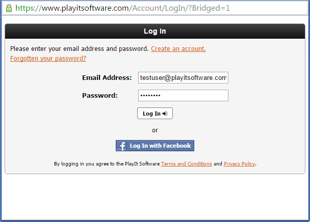 You will be prompted to enter your PlayIt Software account username and password. If you do not have an account, click Create an account and a new window will open for you to create an account. Return to the log in window once you have created an account.