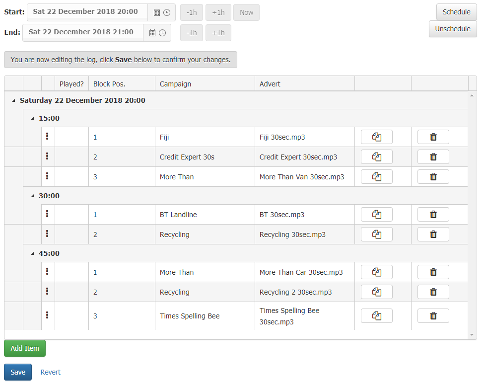 Use the Add Item button to manually add an advert to a block in the advert log.