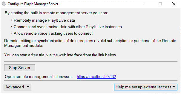 Double-click the PlayIt Manager icon in the notification area (system tray) to show the Configure PlayIt Manager Server window. Here you can stop and start the server if necessary or access the Advanced or External Access sections.