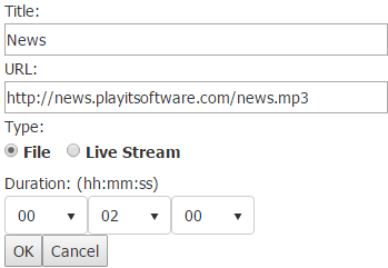 ![]() A File URL typically refers to a static file located on a server which is downloaded by PlayIt Live when it is loaded into a player. Remote files are intended to be a fixed length duration and this must be provided in order to ensure the item is scheduled with the correct length (as this is not known until load time).