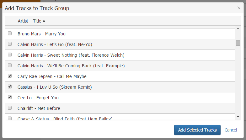 Use this button to add more tracks to this track group. This will show a popup to choose more tracks. Simply select the tracks with the checkboxes and click Add Selected Tracks.