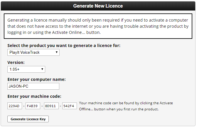 From the Generate New Licence section, select PlayIt VoiceTrack and ensure that v1.05+ is selected as the version, enter the Computer Name and Machine Code you see on PlayIt VoiceTrack and click Generate Licence Key.