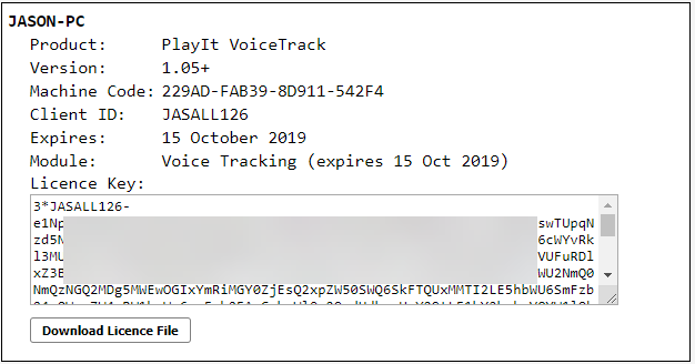 Once generated you will be presented with a licence. Make a note of the Licence Key and copy this to the PlayIt VoiceTrack window. Alternatively, download the licence file and select the file within PlayIt VoiceTrack. Note that licence keys start with the text 3*.