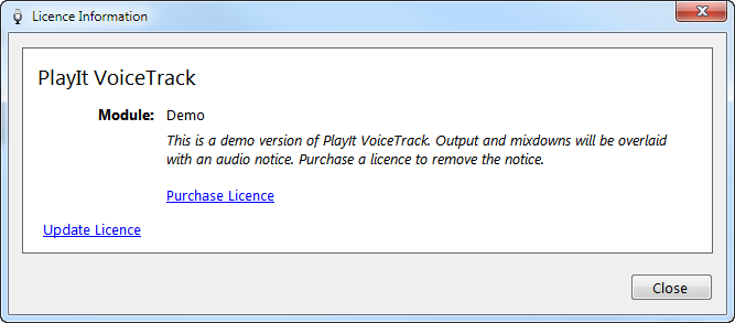 The licence information window shows your current licence information. Initially, this will show the demo module. Use the link to purchase a licence. To update your licence click the link and continue as per these instructions.