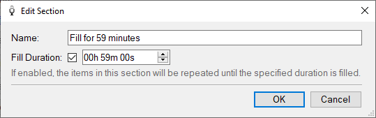 As the name suggests, the Playlist Template Builder is used to build playlist templates. A template is comprised of multiple sections in order. A section can either be a static set of items, or a set of items that fills for a period of time. A section that fills will try its best to fit the items to the time specified. For each item, PlayIt VoiceTrack will select a track that corresponds to the type of the item. It can select a track by track type (e.g. Song), a track group (as defined in Manage > Track Groups), or a specific track (as defined in Manage > Tracks). You can also select Voice Track and specify a time to insert a voice track placeholder for later recording.