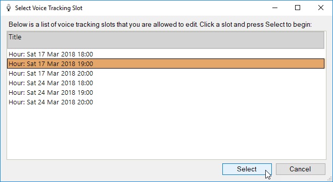 You will be prompted to select a slot you are allowed to voice track into. Select and slot and click Select.