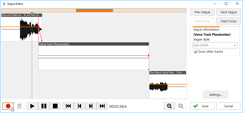 The segue editor works exactly the same as if you were recording a local voice tracked show. You can refer to the Your First Voice Tracked Show section for more detail.