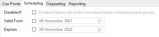 Valid From: Tracks will not be considered by the scheduler when scheduling track group items if the scheduling time is before the Valid From date.
