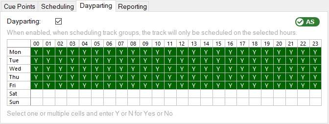 ![]() Under the Dayparting tab you can define at what times of the week the track can play. This is useful if you want to prevent a track from being played at the weekend, for example.