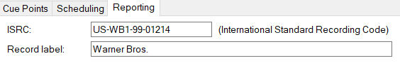 ![]() Under the Reporting tab you can change the ISRC (International Standard Recording Code) and record label for the track. These can be used to report tracks to licensing and royalty collection agencies. You can export these via Manage > Logged Tracks.