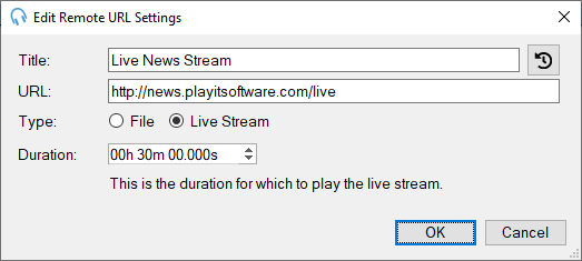 A Live Stream URL typically refers to an audio stream provided by a streaming media server such as Icecast or Shoutcast and could be an internet radio station or a remote DJ stream. PlayIt Live assumes the live stream will run forever so will attempt to restart the stream if the connection is dropped. PlayIt Live will play the live stream until the specified duration has elapsed. Live streams can also be stopped manually, or by using a hard fixed time marker.