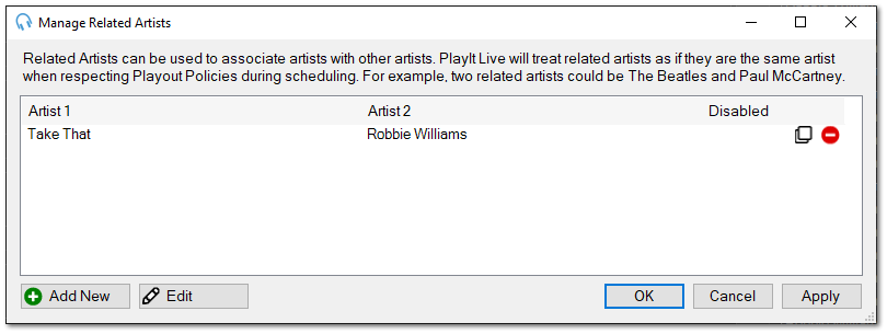 Related Artists are used to associate artists with each other so they are considered as the same artist when scheduling with playout policies. For example, you may not want a solo singer in a band to be played close a song by that band, e.g. Robbie Williams and Take That.