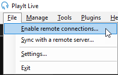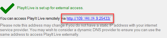 This will enable remote connections to PlayIt Live. Depending on your configuration, you may be required to configure your Windows Firewall and network port forwarding to allow connections from outside your network. You can use the Help me set up external access button to assist you with this.