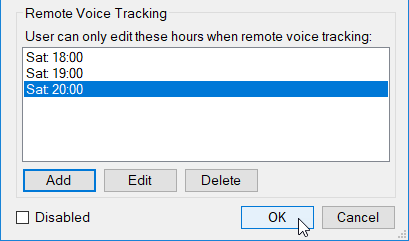 On the Manage Users window, click Add New. Enter a display name, username and password for the user. Then click Add under Remote Voice Tracking to select an hour in the week where the user is allowed to remotely voice track: