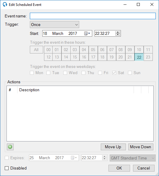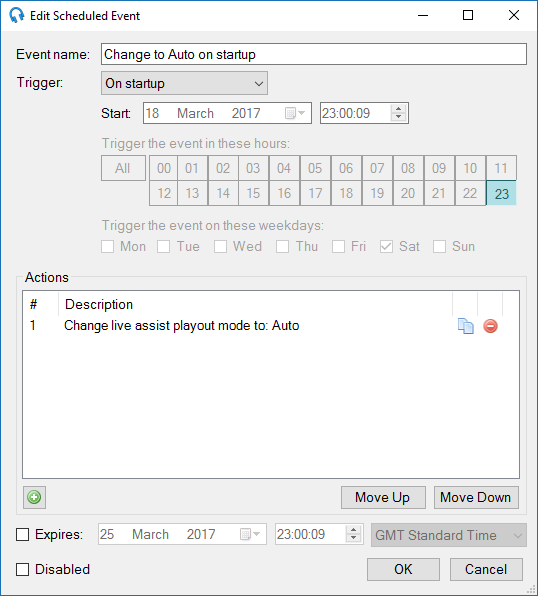 Scheduled Events can be used to trigger actions at a specific time (one-off or recurring). For example, you may wish to start playout at a specific time, change the playout mode to Auto when PlayIt Live starts or automatically insert adverts every hour.