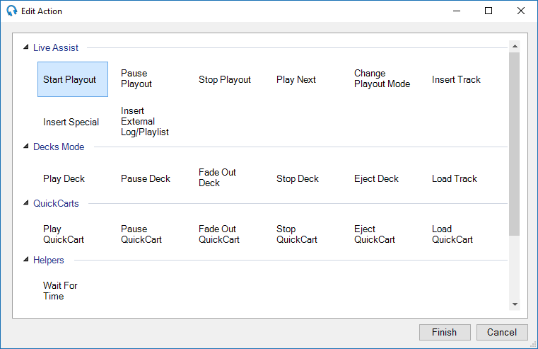 Action parameters that are more complex and may require more explanation are Insert Track, Insert Special and Insert External Log/Playlist.