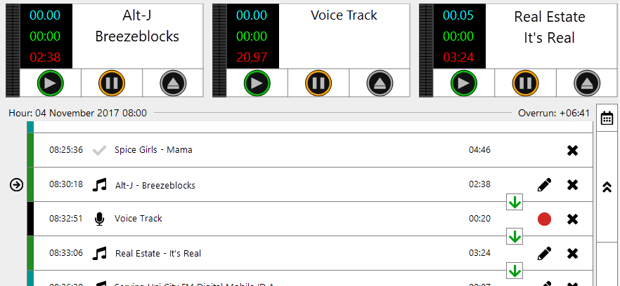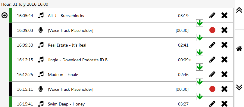 A placeholder will be shown in the playout log for each voice track item you need to record. Click the red circle record icon
