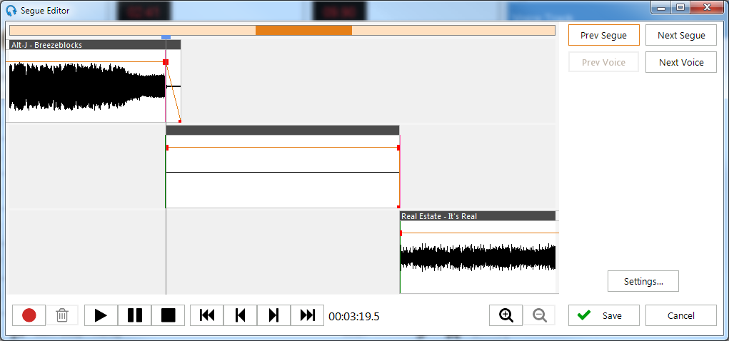 If you are using voice tracking for the first time, go to Settings... and ensure that your microphone device and audition time settings are set up correctly. The audition time is the number of seconds of the end of the previous track you will hear when you start recording your voice track. Remember to click OK to save your settings.