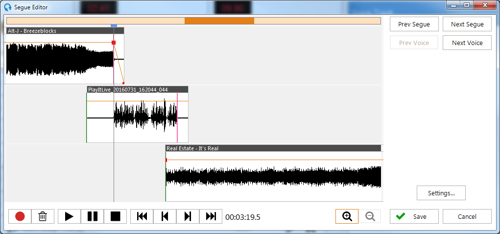 PlayIt Live enables you to do this by inserting Voice Track items into the playout log and recording the audio with your microphone. The recorded audio can then be sequenced with other tracks in the log and tweaked using the segue editor. It is also possible to record voice tracks remotely, on another computer, and send these voice tracks to PlayIt Live. For more information on this see .